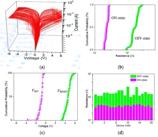 - Huang, P.; Kang, J.; Zhao, Y.; Chen, S.; Han, R.; Zhou, Z.; Chen, Z.; Ma, W.; Li, M.; Liu, L.; et al. Reconfigurable nonvolatile logic operations in resistance switching crossbar array for large-scale circuits. Adv. Mater. 2016, 28, 9758–9764. [Google Scholar] [CrossRef] [PubMed]