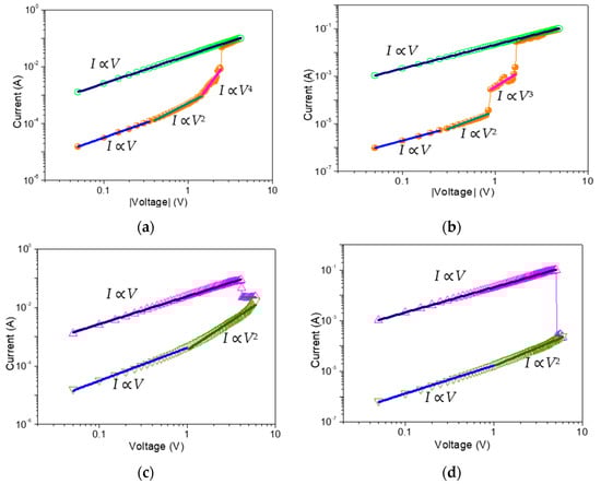 Double-logarithmic plots for (a,b) set and (c,d) reset process with the space-charge-limited model fitting for ITO /GO/ Ni and ITO /GO:0.5 wt%GQDs/ Ni, respectively.