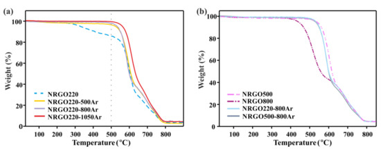Treatment under argon at 800 °C produces samples with a high level of reduction (up to 51.1 at.% of sp2 C) and with a lower decrease in the N content compared to samples prepared by annealing at 1050 °C. In the case of NRGO220-800Ar and NRGO500-800Ar samples, the N content is similar to NRGO800 (5.4–5.8 at.%), but the post-annealed samples show the presence of pyridine N-oxide groups (Table 4). Again, these species contribute to the stabilization of the conjugated system, which would explain the higher thermal stability of the Ar-treated materials against NRGO800 (Figure 4).