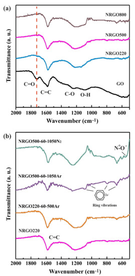 FT-IR of (a) GO and 220 °C, 500 °C, and 800 °C ammonia treated GO and (b) selected NRGO samples after high-temperature treatments under inert atmospheres.