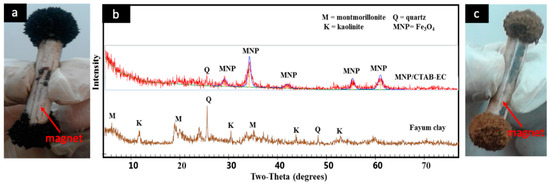 Recently, a solution of cetyltrimethylammonium bromide (CTAB) and hydrogen peroxide (H2O2) was used in the activation of the organic carbon–rich Fayum clay [7]. The increase of the positive charges on the modified clay surface resulted in improving its uptake efficiency, especially for anionic compounds such as hexavalent chromium and methyl orange [7]. Moreover, natural materials coated by magnetic iron oxides nanoparticles (MNP) were applied in the uptake of organic pollutants from water [4,8,9]. Modification of raw materials by MNP resulted in increasing their surface areas and adding new active adsorption sites, especially to interact with basic dyes [4,8]. In addition, the tested MNP adsorbents can be separated by a magnetic field to remove the attached organic contaminates and thus, it can be easily reused [4,8]. It should be remembered that CTAB itself is considered relatively toxic to aquatic organisms and may cause long-term adverse effects in the aquatic environment. Therefore, its sufficient binding to the sorbent should be ensured to avoid its release during the adsorption process. For instance, CTAB-assisted synthesis of ZIF-8 was applied as template to prepare ZIF-8–derived hollow carbon nanostructures as an adsorbent for antibiotics [10].