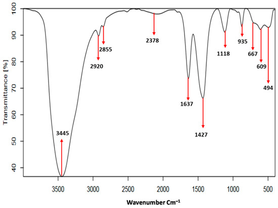 FTIR spectrum of MNP/CTAB‒EC (Figure 3) displays two strong bands at 3445 and 1637 cm−1 which are due to the bending and stretching vibrations of hydroxyl groups (‒OH) of physically attached H2O molecules [4,7]. In addition, the two bands detected at 2850 and 2920 cm−1 from the symmetric and asymmetric stretching vibrations of C–H group confirmed the addition of CTAB to the FC structure [15,23]. Furthermore, the characteristics bands for C–H group in MNP/CTAB‒EC were identified but their intensities were lower than those obtained to CTAB–EC synthesized in a previous study [7]. The decrease of these bands’ intensities could be associated with the covering by iron oxide nanoparticles [15]. The weak band observed at 2378 cm−1 was probably related to immersion of CO2 from the ambient atmosphere [24]. The bands located at 1427 and 667 cm−1 could be attributed to Fe–O group of MNP, which reflected the deposition of Fe3O4 on the CTAB‒EC surface [9,22]. The absorption bands at 1118 and 609 cm−1 were assigned to the stretching of Si–O–Si in silica [4]. The bands at 935 and 494 cm−1 were related to the bending vibrations of Al–OH and the condensed silica, respectively [22].