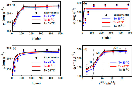CV adsorption onto MNP/CTAB‒EC was tested at different shaking times (from 5 to 480 min) and temperatures of 25, 40, and 55 °C. Results of these experiments are given in Figure 5a. The CV adsorption capacities () were 127.89, 137.89, and 143.48 mg g −1 at 25, 40 and 55 °C, respectively, at the initial interaction times (i.e., up to the first 5 min) of uptake process. In the time interval of 0–5 min, the high adsorption of CV was due to the existence of abundant number of MNP/CTAB‒EC active sites (functional groups) available for CV removal [25]. From 5 to 120 min of dye‒adsorbent shaking time, the values of were 233.52, 238.48, and 241.54 mg g −1 at 25, 40 and 55 °C, respectively. The enhancement of values could be associated to (I) the occupation of further active sites of MNP/CTAB‒EC surface by CV and (II) the diffusion of CV ions into the cavities and pores formed by activation process (i.e., intra‒particle diffusion CV transfer) [7,26,27]. From 120 to the end of interaction time (8 h), the values of MNP/CTAB‒EC were nearly constant (Figure 5a) thus reflecting the equilibrium stage of CV adsorption [25].