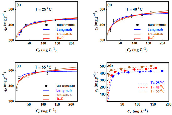 The non–linear plot of against (Figure 6) was used to determine the parameters of each applied model. According to the values, the three classical models fitted well the CV adsorption data (at all adsorption temperatures (25, 40, and 55 °C). Therefore, the Chi–squared () values were used to distinguish the best isotherm model. Freundlich equation showed the smallest values at all temperatures, which reflected the applicability of this model in describing the CV adsorption results. The maximum Langmuir adsorption capacities () of CV were 447.08, 482.69, and 499.36 mg g −1 at 25, 40, and 55 °C, respectively (Table 4).