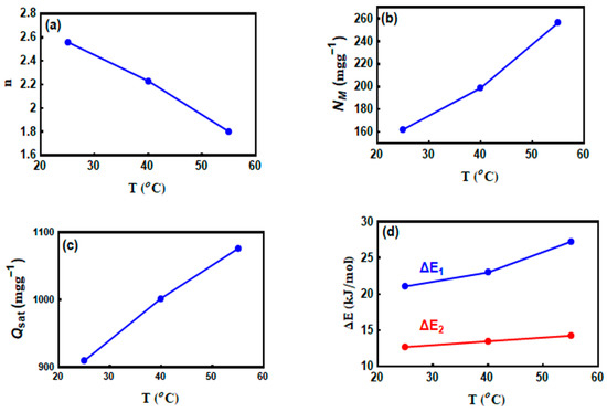 Overall, this parameter plays a major role in descriptive the geometry (horizontal or vertical) of the removed CV molecules on the MNP/CTAB‒EC surface. The horizontal or vertical adsorption orientation of the removed CV molecules are attributed to with value more or lower than unity, respectively. Furthermore, the adsorption mechanism of the CV dye using MNP/CTAB‒EC adsorbent could be multi–docking (n < 1) or multi–molecular (n > 1) [2,10,11,32,33]. Consequently, various active sites of MNP/CTAB‒EC can adsorb one CV molecule when n < 1, while one adsorption site of this composite can adsorb numerous dye molecules if n > 1 [10]. Figure 7a shows the trend of parameter n as a function of solution temperature and Table 6 summarizes the values of this and remaining parameters of tested statistical physics model. The n parameter was 2.56, 2.23, and 1.8 at 25, 40, and 55 °C (i.e., all values were superior to 1). Thus, the vertical adsorption position and multi–molecular mechanism were involved during the interaction between CV molecules and MNP/CTAB‒EC active sites [10,32]. This result indicated that many CV molecules interacted with one MNP/CTAB‒EC active site (i.e., multi‒interactions mechanism) and, therefore, the adsorbed CV molecules were vertically oriented [11,32,33]. In general, three common cases can be used to describe the orientation of adsorbate onto adsorbent surfaces [32].