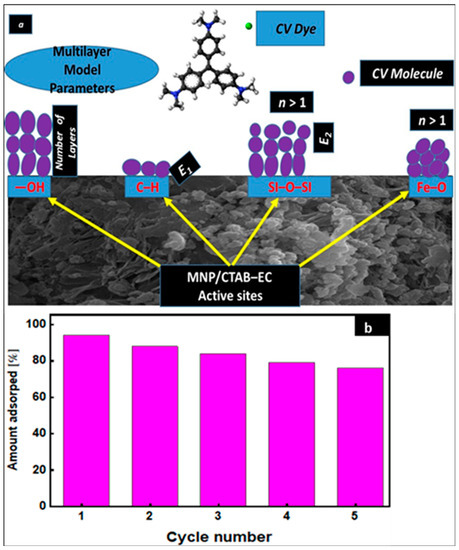 The possibility of multiple applications of an adsorbent is considered as one of the most important issues in adsorption-based industrial processes [34,35,36,37,38,39]. In the current study, five repetition cycles of adsorption/desorption were conducted to evaluate the regeneration of MNP/CTAB‒EC adsorbent. CV dye removal with MNP/CTAB‒EC was 92.88, 88.76, 83.65, 79.18, and 76.54% after cycles 1, 2, 3, 4, and 5, respectively (cf. Figure 8b). This regeneration study revealed that the MNP/CTAB‒EC adsorbent can be reused several times in the CV dye adsorption thus providing an additional economic benefit. A slight decrease in adsorption capacities is observed after each adsorption-desorption cycle, most probably due to the gradual degradation of the sorbent [40], particularly its effective adsorption sites [41] during adsorption and regeneration with NaOH. Another reasons may be related to the irreversible blockage of some adsorption sites and then, CV is not removed during regeneration.