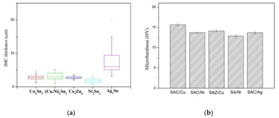 Solder joint properties: (a) thickness of interfacial IMCs and (b) microhardness of the solder portion.
