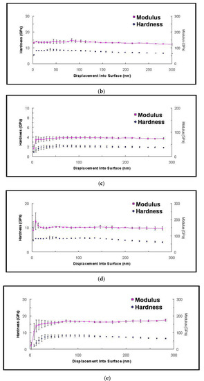 - Oliver, W.C.; Pharr, G.M. An improved technique for determining hardness and elastic modulus using load and displacement sensing indentation experiments. J. Mater. Res. 1992, 7, 1564–1583. [Google Scholar] [CrossRef]