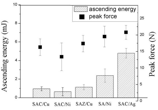 In combination of measured peak force and impact energy, Figure 8 concludes that the joints showing the S fracture mode exhibited excellent impact fracture toughness as well as impact force ((SAC/Ag), while those revealing brittle I fracture mode behaved worse (SAC/Cu and SAC/Ni). The performances of the joints with major mixed fracture mode (M mode; i.e., SAZ/Cu and SA/Ni) were in the middle of them.