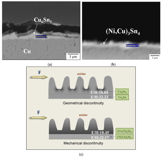 As also shown in Figure 9, the joints with bi-layered interfacial IMCs possessed poor joint impact performance and completely brittle fracture feature. (Cu,Ni)6Sn5/(Ni,Cu)3Sn4 was even worse than Cu6Sn5/Cu3Sn. This could be explained by the E/H difference between two interfacial IMC layers. The magnified cross-sectional images given in Figure 10a,b indicate that, for Cu6Sn5/Cu3Sn, the main crack propagated mostly within the upper Cu6Sn5, while as to (Cu,Ni)6Sn5/(Ni,Cu)3Sn4, the crack passed along the interface between (Cu,Ni)6Sn5 and (Ni,Cu)3Sn4. This inconsistency could be referred to geometrical discontinuity and mechanical discontinuity of the bi-layer IMCs, sketched in Figure 10c. With respect to Cu6Sn5/Cu3Sn, the E/H values for Cu6Sn5 (18.84) and Cu3Sn (22.22) [12] did not diverge too much, therefore the crack propagated within Cu6Sn5, which showed scallop appearance and exhibited many stress concentration sites. In contrast, a significant E/H difference between (Cu,Ni)6Sn5 (18.45) and (Ni,Cu)3Sn4 (32.17) caused discontinuity in IMC mechanical behavior, thereby giving rise to cracking in-between those two phases and inferior impact resistance.