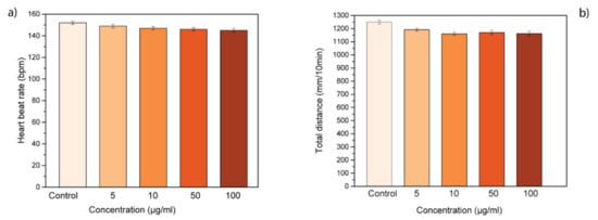 Moreover, the heartbeat rate of treated zebrafish was monitored to evaluate the possible physiological abnormalities induced by GL layers treatment. At the highest concentrations tested, GL layers did not affect the heartbeat rate of exposed larvae. In fact, the heartbeat of treated samples was similar to the control group, treated only with E3 embryo medium (Figure 3a). In addition, we evaluated the locomotor activity of treated larvae at 72 hpf to determine if GL layers could have a continuous influence on larval behavior (Figure 3b). The treatment with different concentrations of GL layers did not lead to hypo- or hyperactivity in the zebrafish larvae in comparison with the control larvae. In summary, GL layers presented no influence on the cardiac and swimming activity of zebrafish larvae with a contrasting trend to other GRMs [,,]. In particular, pristine graphene leads to an alteration of the heartbeat rate and consequently to cardiac defects during embryogenesis.