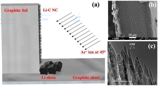 (a) Schematics showing sample setup for Li-C nanocomposite (NC) preparation. (b) Scanning electron microscope (SEM) image showing the top view of Li-C NC grown on the edge of graphite foil. (c) Low Mag transmission electron microscopy (TEM) image showing Li-C NC fabricated by Ar+ ion irradiation at 700 eV. Carbon-based nanofibers (CNFs) grew on top of several conical structures, as exemplified by arrows.