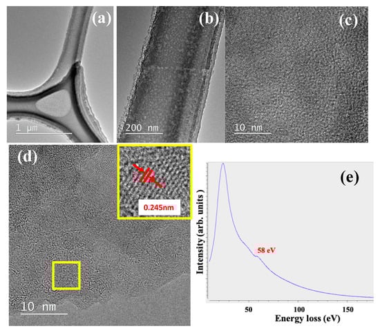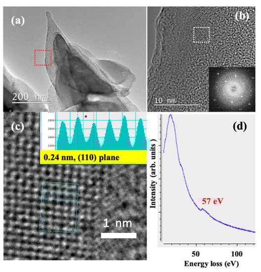 Figure 1b,c shows the scanning electron microscope (SEM) and transmission electron microscope (TEM) images of the as-synthesized Li-C NC, respectively. The conical structures are almost unidirectional and freestanding. Their length and density can be controlled by changing the Ar+ irradiation angle and the time of irradiation. As synthesized, Li-C NC was further characterized at higher magnification to confirm the presence of Li atoms. Figure 2a shows the typical Li-C NC with a short CNF on top. CNFs of longer and slenderer size are unstable under an electron beam, making atomic-scale characterization difficult. Therefore, we selected the Li-C NC with a short CNF. Figure 2b, shows the high magnification TEM image taken around the red squared area of Figure 2a, showing the presence of Li atoms. The fast Fourier transform (FFT) corresponding to the electron diffraction pattern taken around the white square clearly shows sharp diffraction points, indicating the presence of crystalline Li. A high magnification TEM image was taken on the crystalline lattice of Figure 2b, as shown in Figure 2c. Individual Li atoms were clearly visible, with a lattice distance of 0.24 nm corresponding to the (110) plane of Li []. It is to be noted that this the first report on the atomic-level observation of Li atoms under 200 keV TEM operating voltage without the use of a cooling holder and special sample fabrication methods, as reported in previous works []. During TEM observation, no damage to the Li lattice was observed, implying stability of Li nano-domains embedded in an amorphous carbon matrix. Elemental analysis of the Li-C NC was carried out using electron energy loss spectroscopy (EELS). EELS spectra of Figure 2d clearly show the Li peak at 57 eV, which is close to the reported value [,]. It is clearly observed that Li-C NC can act as a host material to store Li, even in ambient conditions.