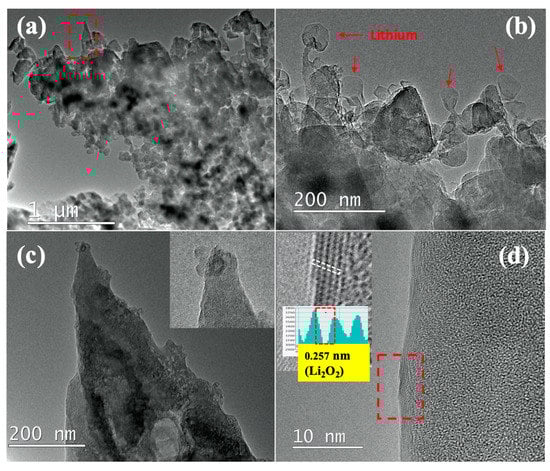 After the optimization of the experimental conditions for the synthesis of Li-C NC, the effect of Ar+ ion energy on the morphology and Li storage of Li-C NC was analyzed in the second set of experiments. To study the effect of the higher Ar+ energy, Li-C NC was synthesized at 1 keV of beam energy. Figure 3a shows the low magnification TEM image of the as-fabricated sample with Ar+ ions sputtered at 1 keV. Interestingly, no particular array of Li-C NC was observed, contrary to the samples synthesized using 700 eV. The presence of a conical structure is observed at only a few places (inside the rectangular area), with most of the samples showing minor protrusions or the deposition of amorphous carbon. However, a large amount of Li was confirmed, as shown in Figure 3b. During TEM observation, the expansion of a Li ball-like structure was observed, as indicated by arrows in Figure 3b. Figure 3c shows an example of rarely present conical NC, showing a large amount of Li attached to the surface of the NC (of the rectangular area of Figure 3a). The inset shows the presence of Li on the tip of the conical NC. Interestingly, no Li lattice was observed inside the C matrix, but a Li-related lattice was visible on the surface of the conical NC, as shown in Figure 3d. As seen in the inset, the line profile taken for the air-exposed atomic lattice shows a higher separation value of 0.257 nm, corresponding to Li2O2 (JCPDS card No. 01-074-0115). From this observation, it can be concluded that under the higher ion beam energy of 1 keV, an excess of Li, which is reactive in air, is sputtered and supplied onto the Li-C NC, suggesting that the Li-C NC formed at higher ion energy densities would be less suitable for battery applications. Previous works have also shown that for the fabrication of metal-embedded CNF, the quantity of metal should be optimum. It can be clearly observed that 700 eV is the preferable energy for the fabrication of Li-embedded NC.