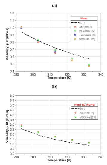 It was found that for pure water the values of dynamic viscosity predicted by use of developed Equation (1) are lower than those presented in the literature within the whole tested temperature range. For lower temperature, Equation (1) underpredicts by ~6%, while for higher temperature, Equation (1) overpredicts the data presented in the literature [,,,,] by ~17%.