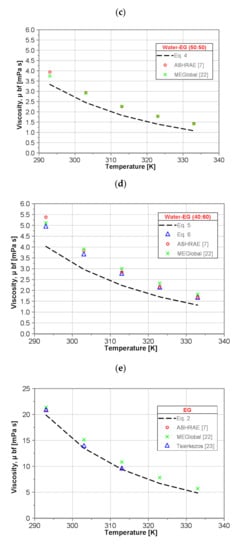 In order to check the credibility of the present results, a comparison of the calculated values of the dynamic viscosity of the base fluids by use of the developed correlations (Equations (1–5)) with the data published in the literature for the temperature range of 293 to 333 K has been conducted. As seen in Figure 1, an at least qualitative agreement with the published data [,,,,] has been achieved.