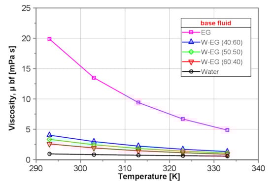 - The results reveal that the dynamic viscosity of the base fluids decreases exponentially as the temperature increases, but the dynamic viscosity of EG and water/EG mixtures decreases more rapidly than water.