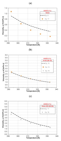Building on their own measurements, Pastoriza-Gallego et al. [] proposed the following correlation for dynamic viscosity of EG-Al2O3 and water-Al2O3 nanofluids,