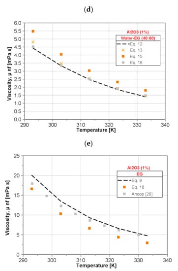 Figure 4 shows a comparison of the dynamic viscosity of the tested nanofluids with nanoparticle mass concentration of 1% obtained by use of the proposed correlation equations presented in Table 2.