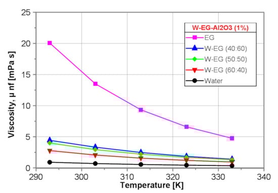 Similarly to the base fluids, the dynamic viscosity of the EG-Al2O3 (1%) nanofluid is the highest one. Moreover, the dynamic viscosity of all the tested nanofluids decreases with water content and temperature increase.