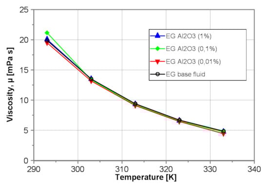 Figure 5, in turn, illustrates the exemplarily influence of the nanoparticle concentration on the dynamic viscosity of the tested EG-Al2O3 nanofluids. As results from Figure 5, the impact of alumina nanoparticles on dynamic viscosity of EG-Al2O3 nanofluids within mass concentration from 0.01% to 1% and temperature range 293K ≤ T ≤ 333K is negligible. The discrepancy between the data is within the measurement error.
