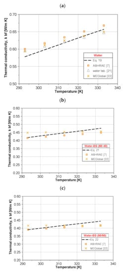In order to check the credibility of the present results, a comparison of the thermal conductivity of the base fluids calculated by the developed correlations (Equations (19–23)) with the data published in the literature for the temperature range of 293 to 333 K has been conducted (see Figure 6).