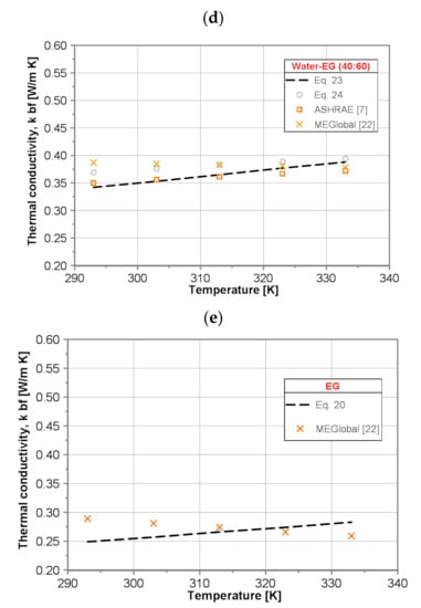 For all three water/EG mixtures, i.e., (60:40), (50:50) and (40:60), corresponding to Equation (21), Equations (22) and (23) underpredict the thermal conductivity of the water/EG mixtures compared to the published data [,,,] for lower temperature and overpredict for higher temperature. The maximum discrepancy occurs for data published in [] and it deviates from −7% to +4 for water/EG (60:40) mixture, from −6% to +6% for water/EG (50:50) mixture and from −13% to +3% for water/EG (40:60) mixture. The Vajjha and Das correlation (Equation (24)) is based on the data provided for water/EG (40:60) mixture in [], and it is seen in Figure 3 that there is a difference between calculated values and data taken directly from the tables. Correlation (Equation (24)) gives higher values of ~6% within the whole tested temperature range.