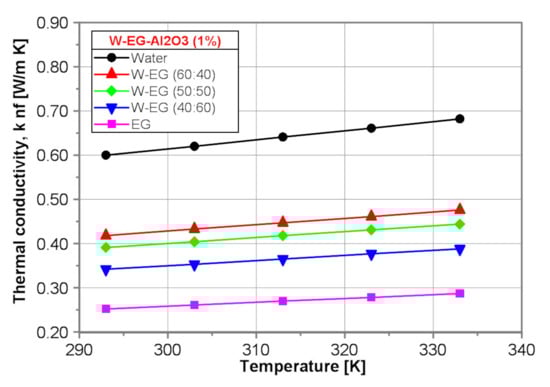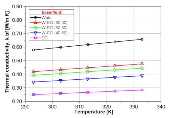 Figure 7 shows a comparison of the thermal conductivity of the tested base fluids obtained by use of the proposed correlation equations presented in Table 4. As it is seen in Figure 7, the thermal conductivity of water is, independent of temperature, over 2 times higher than that of EG. The thermal conductivity of all tested base fluids increases with temperature by ~13%. Thermal conductivity of the water–EG mixtures decreases distinctly with water content decrease.