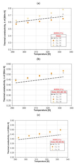 Figure 9 shows a comparison of the thermal conductivity of the tested nanofluids with nanoparticle mass concentration of 1% obtained by use of the proposed correlation equations presented in Table 5.