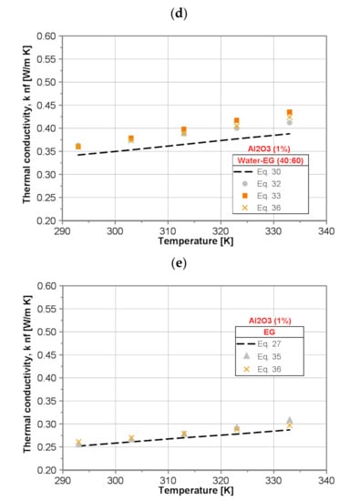 Comparison of thermal conductivity of the tested nanofluids with 1% nanoparticle mass concentration: (a) water/Al2O3, (b) water/EG (60:40)/Al2O3, (c) water/EG (50:50)/Al2O3, (d) water/EG (40:60)/Al2O3 and (e) EG-Al2O3.