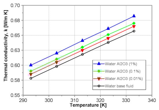 Figure 10, in turn, illustrates exemplarily influence of the nanoparticle concentration on the thermal conductivity of the tested water-Al2O3 nanofluids. As shown in Figure 10, the addition of alumina nanoparticles results in an increase of thermal conductivity of water-Al2O3 nanofluids from 1.2% to 3.8% for mass concentration of 0.01% and 1%, respectively.