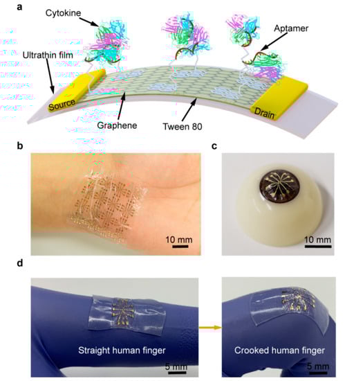 Graphene, an attractive two-dimensional nanomaterial, is extremely sensitive to its surface charge distribution, and widely used as the transducer for sensors due to its outstanding electrical properties [9,10,11]. Especially, with the aid of aptamers, the graphene field-effect transistor (GFET) can enable the sensitive, rapid and label-free detection of cytokines [12,13,14]. To date, efforts have been made to use GFET biosensors in wearable applications due to the high mechanical flexibility of graphene [15,16,17]. Such sensors are fabricated on sheets of polymers, such as polydimethylsiloxane (PDMS), polyester (PET) and polyethylene naphthalate (PEN) [18,19,20]. However, these polymer sheets, whose overall thicknesses are 100 μm or more, would hardly be subject to large deformations and curvature (with radii ranging from 4 to 40 mm). As such, GFET biosensors with an extremely thin substrate that can sustain the large deformations involved in physiologically and biochemically relevant measurements on non-planar human body surfaces are still highly desirable.