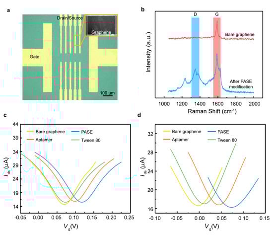 A microscope image of the GFET biosensor fabricated on the ultrathin film is shown in Figure 2a. The surface functionalization of the graphene with PASE was confirmed using Raman spectra (Figure 2b). The modification of the PASE split the G band, illustrating the coupling of graphene with the pyrene group on PASE. Furthermore, the Dirac point shift ΔVDirac,where ΔVDirac = VDirac – VDirac,0 with VDirac,0 the Dirac point obtained in the solution without biomarker, before and after PASE, aptamer and Tween 80 functionalization was measured with the gate voltage Vg increasing from −0.2 to 0.4 V at a fixed drain-source voltage Vds of 0.01 V (Figure 2c,d). ΔVDirac was observed to be monotonically increased after PASE functionalization, indicating that the p-type doping of the graphene had been induced. Upon the attachment of the aptamer specific to TNF-α and IFN-γ, ΔVDirac decreased by 0.04 and 0.057 V, respectively. Tween 80, a chemically stable nonionic surfactant, was used to block the uncoated graphene area to suppress the nonspecific adsorption in artificial tears due to its low binding affinity to the abundant non-target molecules present in the tears [23,24]. After the modification with Tween 80, the Dirac point VDirac shifted towards the direction of the negative gate voltage, illustrating that Tween 80 induced the n-type doping of the graphene. Thus, it was concluded that the biosensor was successfully functionalized using different aptamers.