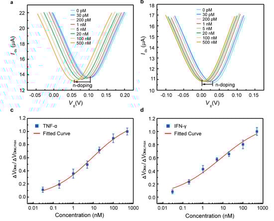 Cytokine detection in artificial tears. Transfer characteristic curves measured when the biosensor was exposed to (a) TNF-α and (b) IFN-γ solutions with various concentrations. The normalized Dirac point shift as a function of the (c) TNF-α and (d) IFN-γ concentration. The fitted curves were fitted using the Hill–Langmuir equation.