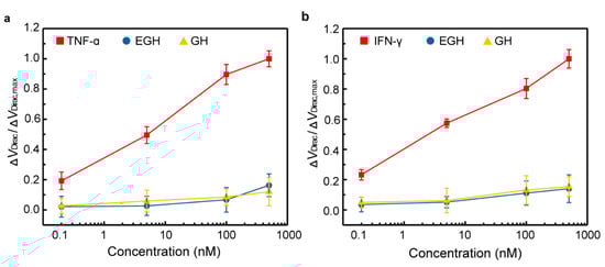 To investigate the specificity of the biosensor, EGF and GH, two related proteins, were chosen as control proteins. The biosensor, modified with the aptamer specific to TNF-α, was firstly exposed to control proteins in artificial tears (Figure 4a). The sensing signal for TNF-α significantly increased with the adding of TNF-α concentrations. The normalized ΔVDirac/ΔVDirac,max for TNF-α at 500 nM was over six times larger than that for control proteins (14.3%) at the same concentration. Additionally, the dissociation constant KD for the control proteins was investigated. KD was estimated to be 1.43 × 1010 and 1.77 × 109 nM for EGH and GH, respectively, which is much larger than the KD for TNF-α (8.43 nM). Subsequently, the biosensor modified with the aptamer specific to IFN-γ was tested using these control proteins (Figure 4b). The ΔVDirac/ΔVDirac,max for IFN-γ is also six times larger than those for the control proteins (15.6%) at the same concentrations. Furthermore, the KD was calculated to be 1.55 × 106 and 2.73 × 106 nM for EGH and GH, respectively, which is tens of thousands of times larger than the KD for IFN-γ (7.36 nM). Hence, the biosensor has a high level of specificity for the target cytokine in artificial tears.