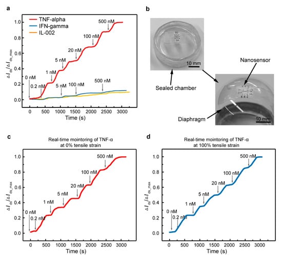 To verify the feasibility of the biosensor for wearable applications, time-resolved measurements were employed, using the biosensor modified with an aptamer specific to TNF-α as a representative. As shown in Figure 5a, the device was first exposed to different concentrations of TNF-α in artificial tears. The characterization started with the injection of the artificial tears in the PDMS well, then the artificial tears spiked with various TNF-α concentrations were injected after each binding equilibrium at corresponding concentrations. The changes in the drain-source current are denoted as ΔIds, and the maximum change is denoted as ΔIds, max. The sensing signal was observed to increase stepwise and significantly from 0 to 0.98 with increasing TNF-α concentrations from 0 to 500 nM. Moreover, it was found that equilibrium was reached after the binding of aptamer with TNF-α within 7 min at different concentrations. By contrast, the ΔIds/ΔIds, max—generated by related cytokines (IFN-γ and IL-002)—was less than 15% compared with that for TNF-α at the same concentration.
