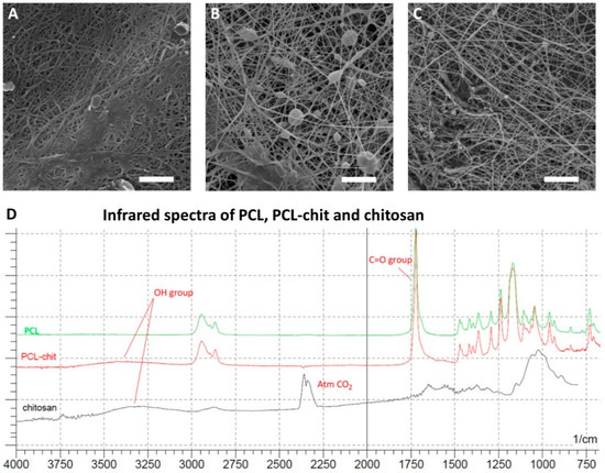 Morphology of nanofibers determined by SEM, poly-ε-caprolactone-chitosan (PCL-chit) (A), PCL-chit-PEGb (B) and poly(ethylene oxide)-chitosan (PEO-chit) (C). Characterization of PCL, PCL-chit and chitosan nanofibers by FTIR (D). Scale bar: 5 µm.