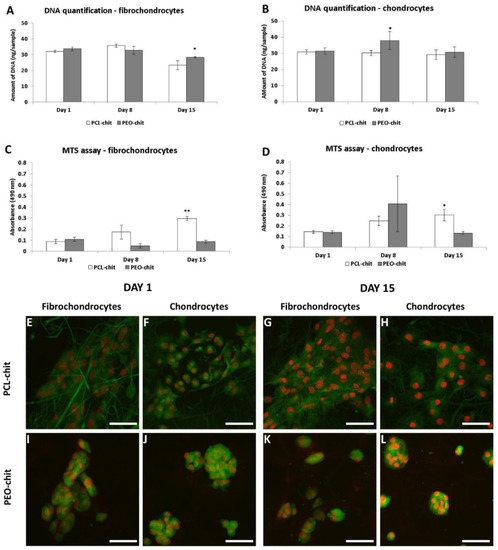 DNA quantification (A,B) and metabolic activity, measured by MTS assay (C,D) and visualization of fibrochondrocyte and chondrocytesadhesion and distribution on PCL-chit and PEO-chit scaffolds on days 1 and 15 using a confocal microscope (E–L). The values were compared statistically between the samples on the same day. Cell nuclei were stained using propidium iodide (red color) and cell internal membranes using DiOC3 (green color). Magnification: 600×; scale bar: 50 µm. Data are shown as mean ± standard deviation, * p < 0.05 and ** p < 0.001.