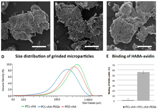 Morphology of grinded particles by SEM, PCL-chit (A), PCL-chit-PEGb (B) and PEO-chit (C). Distribution of microparticles (MPs) by DLS (D). Binding of the 4′-hydroxyazobenzene-2-carboxylic acid (HABA)–avidin complex to chitosan and to chit-PEGb (E). Scale bar: 100 µm.