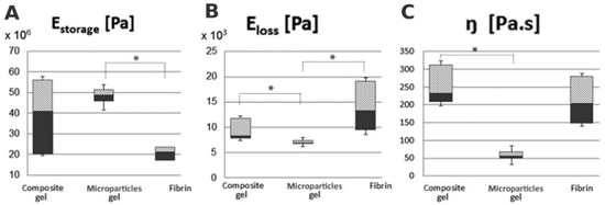 Storage modulus Estorage was significantly higher in the composite gel with MPs than in fibrin (Figure 5A). Eloss of both composite gel and fibrin was significantly higher than that of the composite gel with MPs (Figure 5B). Similarly, the composite gel showed a significantly higher viscosity than the composite gel with MPs.