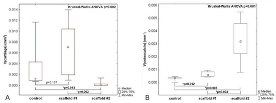 The volume of the newly formed hyaline cartilage (A) and osteocalcin-positive osteoblasts and bone matrix (B) within the center of the defect. A—The volume of the cartilage was greater in the scaffold #1 group (PCL-chit-PEGb MPs mixed with collagen/fibrin/PRP gel) than in the scaffold #2 group (PCL-chit-PEGb-antiCD44 MPs mixed with collagen/fibrin/PRP gel) (Mann–Whitney U test p = 0.002). The volume of cartilage was comparable in the scaffold #1 group and in the control group (untreated) and smaller in the scaffold #2 group than in the control group (p = 0.013). B—The volume of the osteocalcin-positive elements was greater in both the scaffold #1 (p = 0.012) and scaffold #2 (p = 0.003) groups when compared with the control group. The volume of osteocalcin-positive elements was greater in the scaffold #2 group than in the scaffold #1 group (p = 0.004).