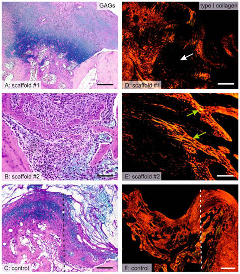 Comparison of the histology of healing with scaffold #1, scaffold #2, and without a scaffold. The microphotographs show either the central part of the defect (A–C,E) or the peripheral part of the defect (C,F). The border between the defect (C—right part of the image, F—left part of the image) and the original cartilage is marked by the dashed line. The alcian blue/PAS stain (A–C) demonstrated the glycosaminoglycans and the morphology of the samples. A—In samples with scaffold #1, a similar amount of hyaline cartilage was found when compared to the control samples (C). B—In samples with scaffold #2, desmogenous ossification was found on the bottom and on the sides of the defect. Picrosirius red (D–F) shows type I collagen fibers as red to yellow when observed in polarized light (right). D—Regions occupied by hyaline cartilage were negative for type I collagen and were dark (white arrow). E—The matrix of bone trabeculae found in the samples with scaffold #2 were positive for collagen I (green arrows). F—In control samples, large areas were filled by type I collagen-positive connective tissue. Scale bar: 200 μm (A,D); 100 μm (B,C,E); 500 μm (F).