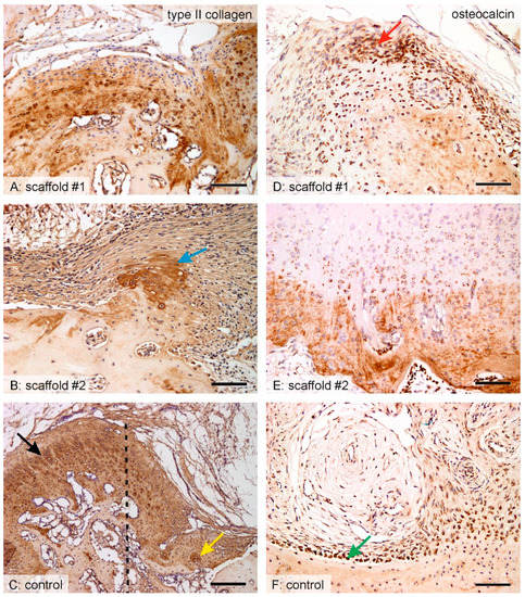 Comparing the histology of healing with scaffold #1, scaffold #2, and without a scaffold using type II collagen and osteocalcin immunohistochemistry. The microphotographs show the central part of the defect (A,B,D–F) or the peripheral part of the defect (C). A—In samples with scaffold #1, type II collagen-positive regions of hyaline cartilage were distributed in various regions of the defect, but mostly adjacent to the bone. D—In samples with scaffold #1, the surface of the bone was usually covered with osteocalcin-positive osteoblasts that were sometimes arranged in groups (red arrow). B—In samples with scaffold #2, only small islets of hyaline cartilage (blue arrow) were found. E—In samples with scaffold #2, the wall of the defect contained bone trabeculae with osteocalcin-positive bone matrix protruding into the defect and covered by osteoblasts. C—In control samples, the newly formed type II collagen-positive cartilage within the defect (yellow arrow) was only found close to the wound margins (dashed line, defect is on the right side of the image) and they were continuous with the articular cartilage outside the defect (black arrow). F—In control samples, most of the bone at the bottom and on the sides of the defect was covered by a single layer of osteocalcin-positive osteoblasts (green arrow). Immunohistochemistry for type II collagen (left) and osteocalcin (right) displayed a positive reaction in dark brown, counterstaining Gill’s hematoxylin. Scale bar: 100 μm (A, B, C right) and 200 μm (C left).