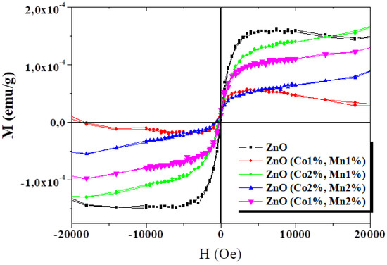 - Khan, R.; Zulfiqar, Z.; Fashu, S.; Ur Rehman, Z.; Khan, A.; Ur Rahman, M. Structure and magnetic properties of (Co, Mn) co-doped ZnO diluted magnetic semiconductor nanoparticles. J. Mater. Sci. 2018, 29, 32–37. [Google Scholar] [CrossRef]