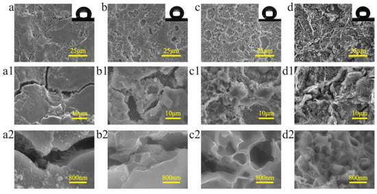 Surface morphology is one of the main factors affecting the superhydrophobic property. In this experiment, surface morphology was mainly determined by ECE time. Figure 3 shows the morphology evolution of the surface machined by EDM and ECE. Figure 3a shows the surface only machined by EDM without ECE, which had a typical surface morphology of the EDM machined titanium surface with craters and cracks. Figure 3a1,a2 shows the enlarged SEM image of the cracks on the surface. The surfaces machined under different ECE times were prepared. Figure 3b–d shows the change in the surface morphology under different ECE times. It can be seen that nanoscale structures first formed at the edge of the crack (Figure 3b,b1,b2). When the ECE time was 20 s, a layer of nanoscale structures covered the EDM machined surface (Figure 3c,c1). However, as the ECE time increased, the microscale craters gradually disappeared with material removal (Figure 3d,d1).