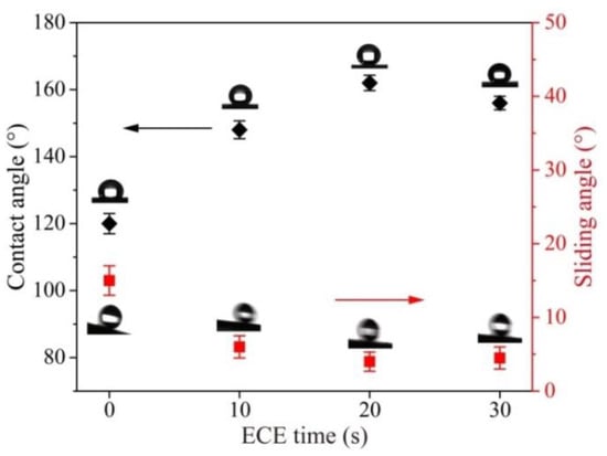 Static water contact angle and sliding angle on EDM surfaces under different ECE times.