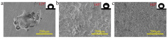 The corrosion resistance behavior of the superhydrophobic surface was evaluated by potentiodynamic polarization (Tafel) curves and electrochemical impedance spectroscopy (EIS). The tests were examined in a three-electrode cell with the electrochemical workstation (CHI660D, CH Instruments Inc., Austin, TX, USA) in 3.5 wt% NaCl solution at room temperature. The graphite electrode, workpiece, and silver/silver chloride (Ag/AgCl, 3 M KCl) electrode were the counter electrode, working electrode, and reference electrode, respectively. Tafel curves were carried out at a scanning rate of 1 mV s−1. EIS tests were carried out under 10 mV of the amplitude of the perturbation voltage and frequencies ranging from 105 to 10−1 Hz. The mechanical durability of the superhydrophobic surface was examined by sandpaper abrasion [34,35]. The superhydrophobic surface moved on sandpaper (Grit No. 1000) with a speed of 18–25 mm s−1 and normal pressure of 4.9 kPa and 15 kPa on it. The values of CA and SA were recorded after each 30 cm abrasion. Each test was repeated more than three times to verify the repeatability of the results.