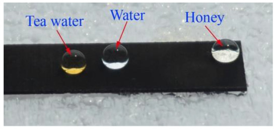 Figure 7 shows the photograph of different liquid droplets on the as-prepared superhydrophobic surface. It can be seen that not only the water droplet, but also the tea water and honey remained in a spherical state on the as-prepared superhydrophobic surface. The CA of the tea water and honey could reach162° and 156°, respectively. All of these easily rolled off the as-prepared superhydrophobic surface under an external force.