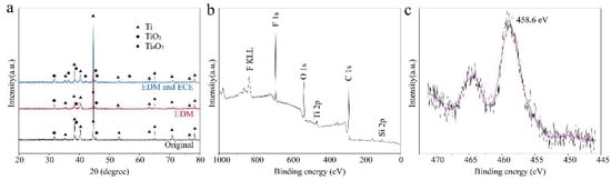 Characterization of the chemical structure of surfaces under different processes. (a) XRD pattern of the original titanium surface, EDM surface, and EDM and ECE process, (b) XPS of the survey spectrum of the as-prepared superhydrophobic surface, (c) high-resolution XPS scanning of the Ti 2p spectrum of the as-prepared superhydrophobic surface.
