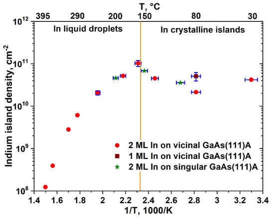 Temperature density dependence of self-assembled indium islands. Red circles correspond to 2 ML In deposited on vicinal GaAs(111)A with 2 miscut towards ; the brown square corresponds to 1 ML In deposited on vicinal GaAs(111)A with 2 miscut towards at 80 C; and green stars correspond to 2 ML In deposited on singular GaAs(111)A at 100, 150, and 200 C. Temperature error is ±5 C. The temperature or density error bar is not presented if it is less than the size of red circles or green stars. Orange line indicates the indium melting point ( = 156.6 C).
